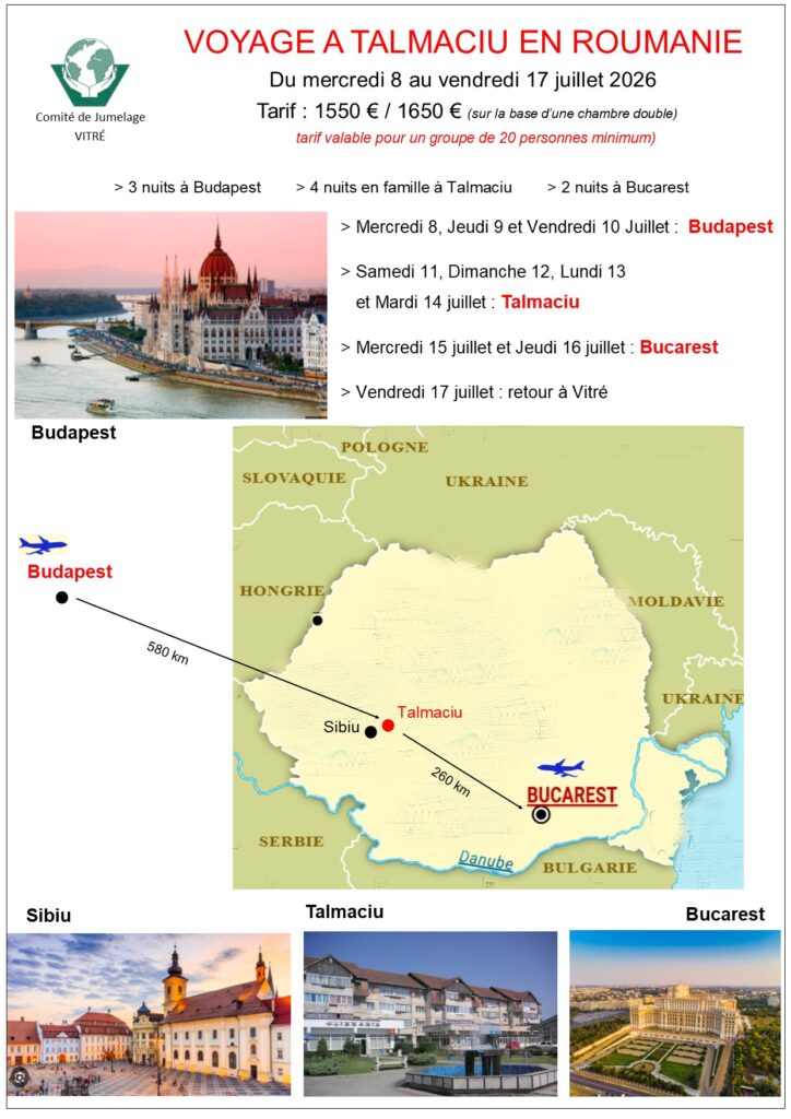 Proposé en juin 2025, ce voyage n’a pas pu se faire. Nous proposons à nouveau ce voyage en juillet 2026, nous faisant aller de Budapest (Hongrie) à Bucarest (Roumanie) en faisant un séjour de 4 jours à Talmaciu durant lequel nos amis roumains nous feront découvrir les beautés de leur région et notamment Sibiu.